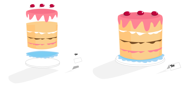 Los cuatro objetos (izquierda) se ordenan de arriba a abajo para crear la imagen final (derecha).