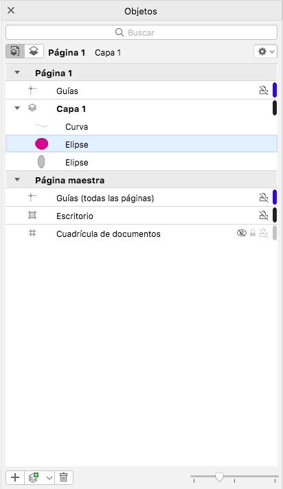 El inspector Administrador de objetos muestra la estructura de capas predeterminada. Los nombres de la página y capa activas aparecen en la parte superior.