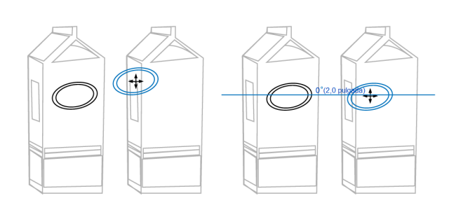 En primer lugar, la elipse se ha arrastrado por su punto de encaje central (izquierda) al borde del otro envase y, a continuación, a la derecha para que aparezca una guía dinámica (derecha).