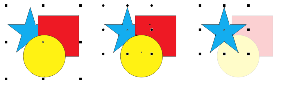 Un grupo de objetos seleccionado (izquierda), un objeto dentro de un grupo de objetos seleccionado (centro) y un objeto dentro de un grupo de objetos en el modo Enfoque (derecha).