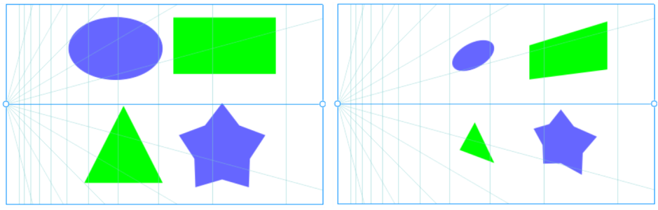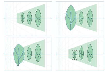 Algunos objetos se dibujan en un plano de perspectiva (superior izquierda). Al hacer clic con la herramienta Forma, el primer objeto se coloca temporalmente en el plano ortográfico (superior derecha). La herramienta Forma se utiliza para editar la forma (inferior izquierda). Cuando se selecciona la herramienta Selección, el objeto editado se vuelve a colocar automáticamente en el plano de perspectiva (inferior derecha).