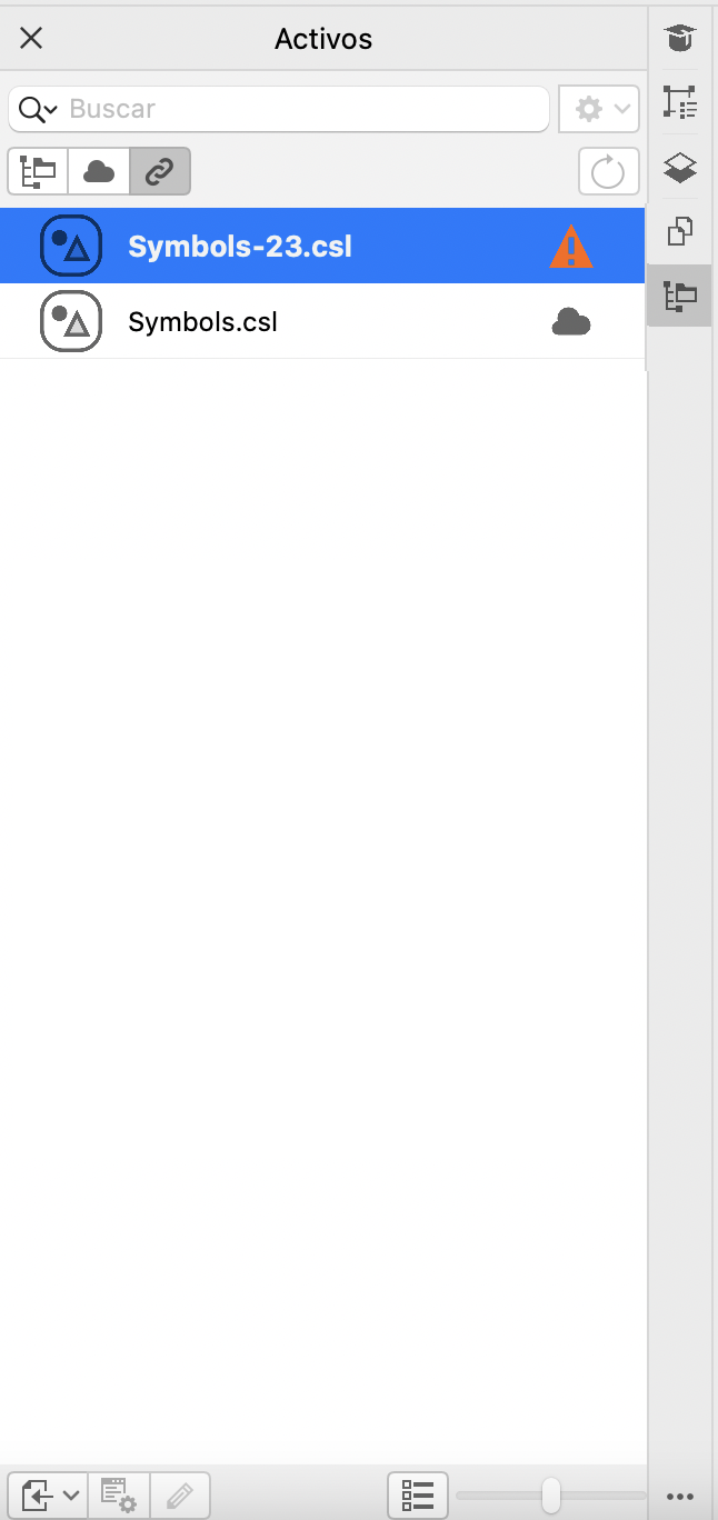 Cuando encuentre la biblioteca de símbolos que necesita, podrá vincularla al documento, de manera que esté disponible para su uso. La vista Activos vinculados del inspector Activos le permite acceder a las bibliotecas de símbolos que están vinculadas al documento activo. Si las bibliotecas de símbolos están vinculadas desde la nube, puede actualizar la lista de archivos para sincronizarla con la carpeta en la nube.