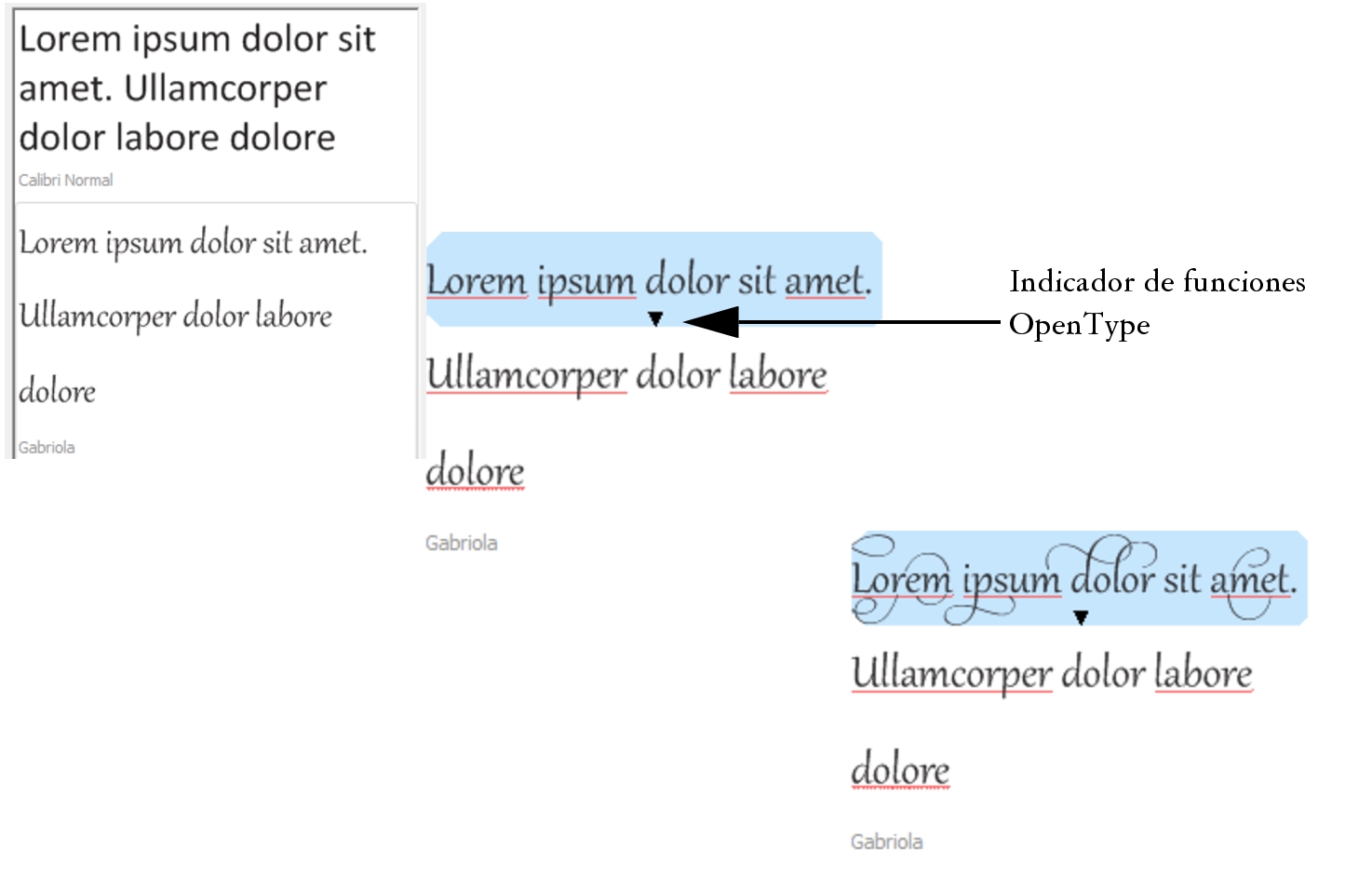 Si las muestras de texto utilizan fuentes OpenType, puede seleccionar el texto para que muestre el indicador de función OpenType y aplicar una de ellas. En este ejemplo, se aplicó un conjunto estilístico al texto seleccionado.
