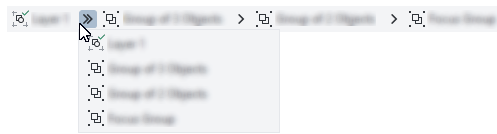 Al activar el modo Enfoque, aparece una barra de herramientas flotante en la esquina superior izquierda de la ventana de dibujo que muestra el lugar del objeto enfocado en la jerarquía del diseño. Mediante los controles de la ruta de navegación de la barra de herramientas flotante, puede cambiar el enfoque a otras partes del diseño sin abrir la ventana acoplable Objetos.