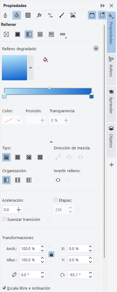 Seleccione los dos nodos o el punto medio entre ellos y en el área Relleno de la ventana acoplable Propiedades y escoja una opción de dirección de mezcla: