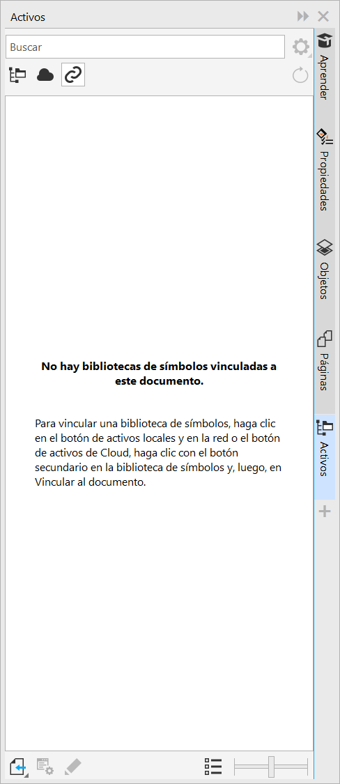 Cuando encuentre la biblioteca de símbolos que necesita, podrá vincularla al documento, de manera que esté disponible para su uso. La vista Activos vinculados de la ventana acoplable Activos le permite acceder a las bibliotecas de símbolos que están vinculadas al documento activo. Si las bibliotecas de símbolos están vinculadas desde la nube, puede actualizar la lista de archivos para sincronizarla con la carpeta en la nube.