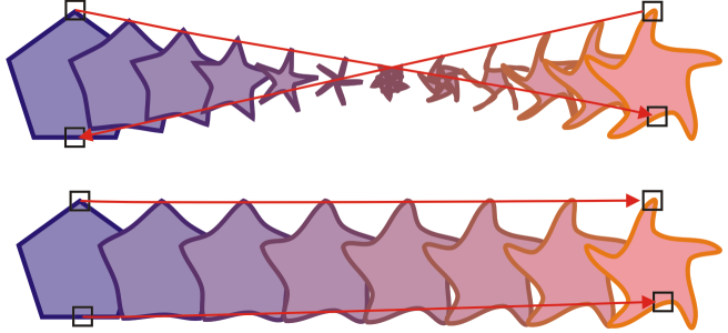 通过映射节点,可以控制调和的外观。多边形上的两个节点映射到星形的两个节点,显示出更平缓的过渡(下)。