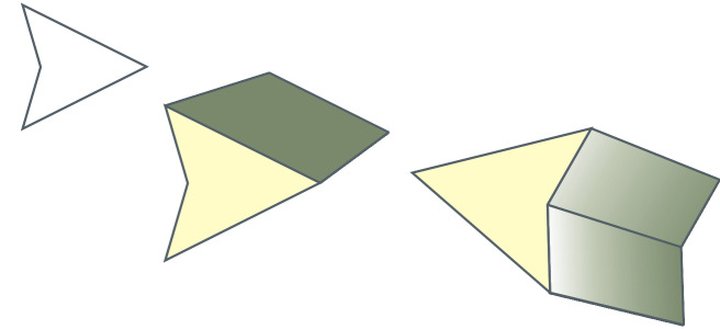 从左至右依次为:简单形状、纯色立体化填充的形状和已应用立体化渐变填充和旋转的形状。