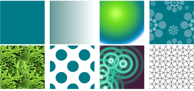 填充示例:均匀、线性渐变、椭圆形渐变、矢量图样、位图图样、双色、底纹和 PostScript