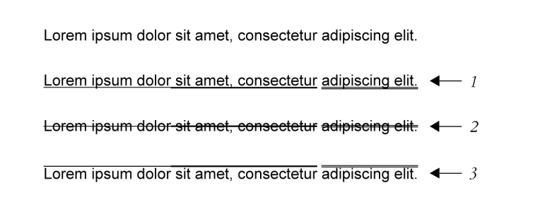 同时使用单线样式和双线样式将带下划线 (1)、删除线 (2) 和上划线 (3) 的美术字应用到文本。