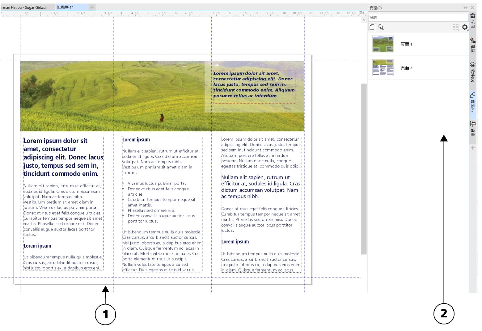 在单页视图中,一次仅显示一个页面;要在页面之间导航,请单击文档导航器中的相应页面标签 (1),或是页面泊坞窗中的页面名称 (2)。