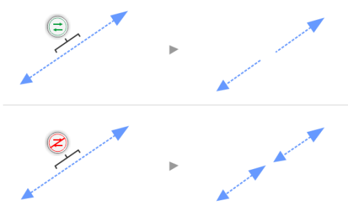 上部:轮廓(此示例中是具有箭头的虚线)在分割后转换为对象,保留了原始外观。下部:使用了"保留轮廓"选项,形成了具有开始和结束箭头的两行。