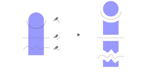 (从上到下)提供三种对象拆分模式:贝塞尔曲线、2 点线和手绘线。