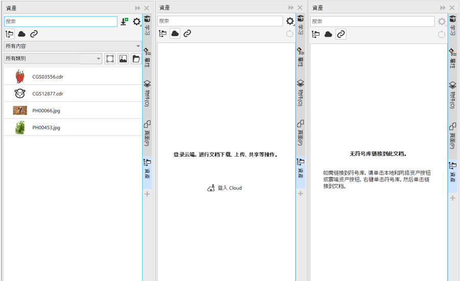 资产泊坞窗提供三种视图来帮助您处理内容。本地和网络资产视图显示存储在本地或网络文件夹中的矢量和位图图像以及其他资产。云资产视图显示云文件夹中的文件,其中包括与您共享的符号库文件。链接的资产视图显示链接到活动文档的符号库。