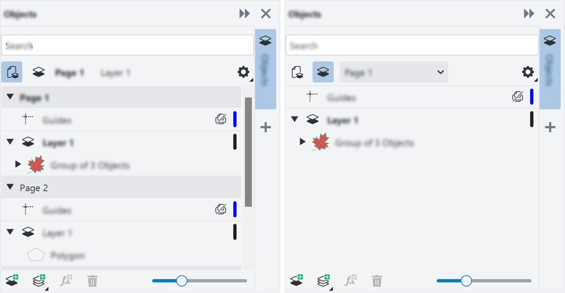 对象泊坞窗中的视图使您可以不同方式显示文档的组件。选择哪种视图取决于文档和要执行的任务的复杂性。例如,在很长的多页文档中,可以选择仅查看页面,以便能够更轻松地浏览文档且每次仅查看一页。通过图层和对象视图可查看所有会影响选定页面的图层并对其重新排序。