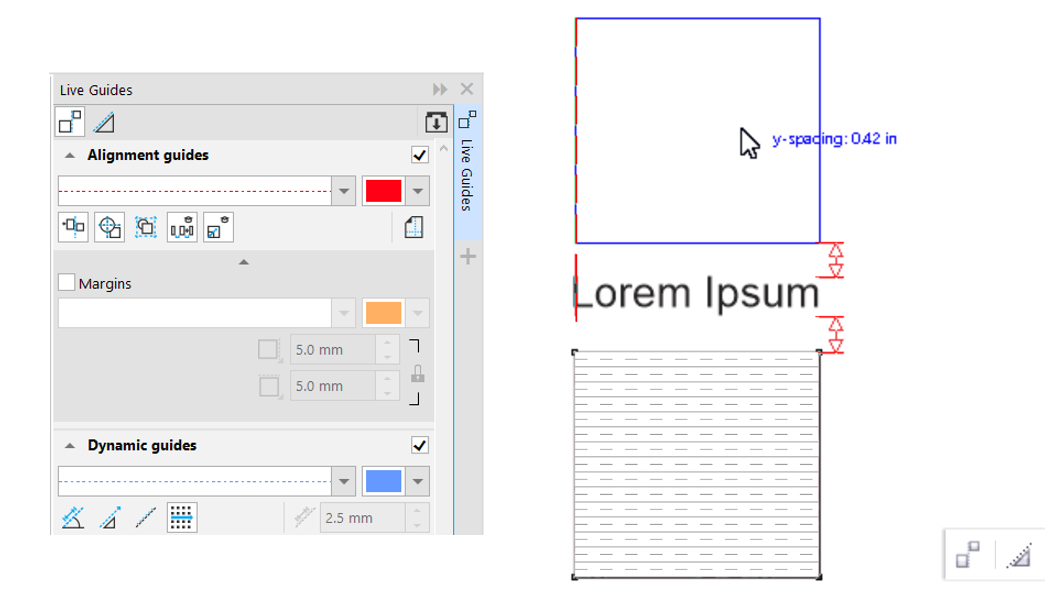 You can align objects interactively on the drawing page by using alignment guides. Alignment guides are temporary guidelines that appear when you create, resize, or move objects in relation to nearby objects. While dynamic guides provide precise measurements for creating technical illustrations, alignment guides are useful in page layout to align text or graphic elements quickly and accurately.
