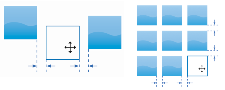 Intelligent Spacing displays indicators when an object is equidistant from two other objects (left) or has the same spacing as the closest onscreen objects (right).