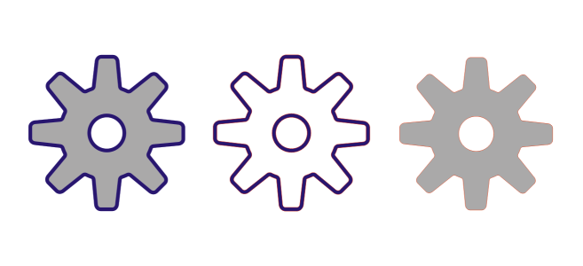 The gear drawing on the left has a gray fill and a blue outline. By converting the outline to an object, you can separate the new object (center) from the old filled shape (right).