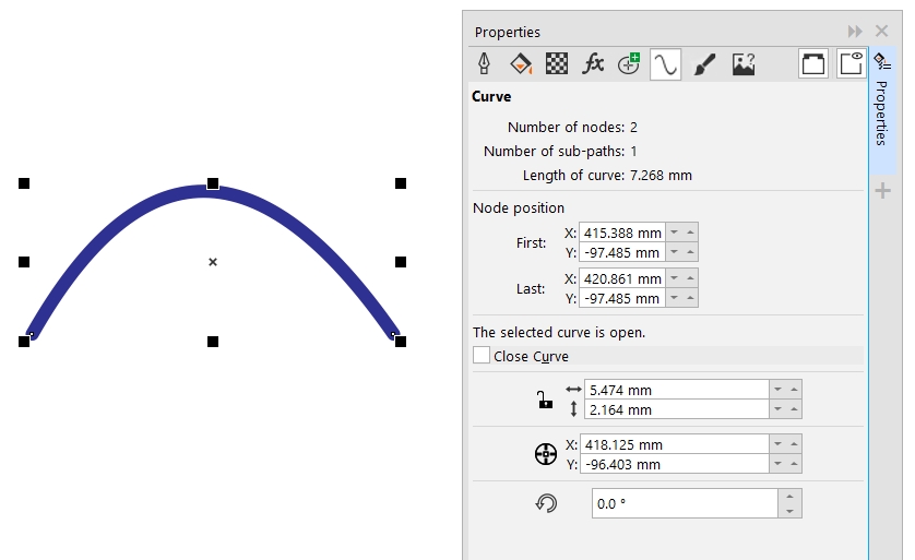 The Properties docker lets you view curve properties such as the number of nodes and subpaths, length as well as node position.