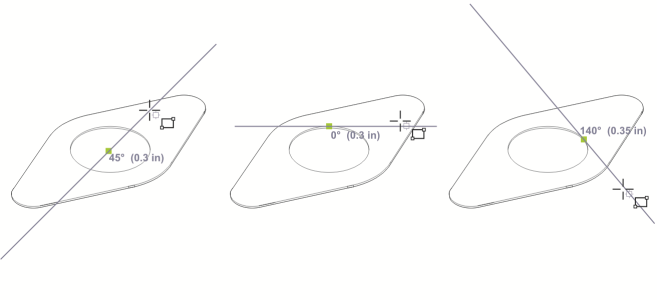 Left to right: The 2-point rectangle tool is used to display dynamic guides from a center snap point, a quadrant snap point, and a tangent snap point.
