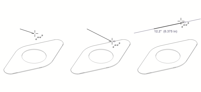 To draw a parallel line, start drawing a straight line (left). Next, move the pointer over the edge of a straight line segment (middle). Finally, move the pointer back until a parallel dynamic guide appears, and drag along the guide until the parallel line is the length you want (right).