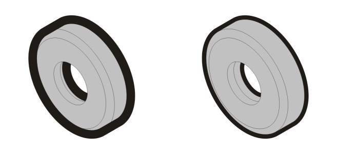 In the drawing on the left, the outline is in front of the fill. Because the outline width is centered on the object’s path, the outline covers part of the object’s fill. In the drawing on the right, the outline width is the same, but the outline has been moved behind the fill and therefore lines up with the outer edge of the object.