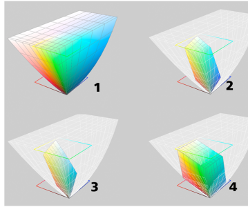 Colors are defined by their color space. 1. Lab color space. 2. sRGB color space, displayed against the Lab color space. 3. U.S. Web Coated (SWOP) v2 color space. 4. ProPhoto RGB color space.