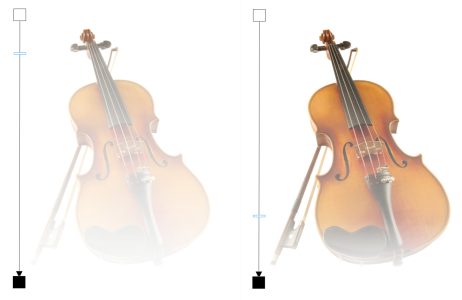 A linear fountain transparency was applied to the violin (left), and adjusted by dragging the slider in the image window (right).