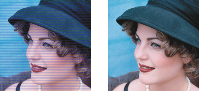 You can remove lines from scanned or interlaced video images. These lines can be filled with copies of adjacent lines of pixels, or with colors derived from surrounding pixels. You can also remove moiré or noise. Moiré is the wave pattern produced when halftone screens of two different frequencies are superimposed on the same image. Noise is the speckled effect produced by scanning or video-capturing.