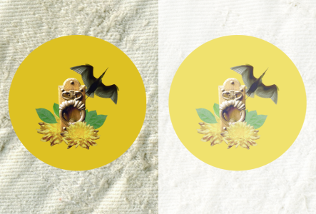 The original image (left) contains grouped objects. A lens effect was applied to the group (right). The Pass Through merge mode was applied to the group so the lens changed the gray background behind the group as well.